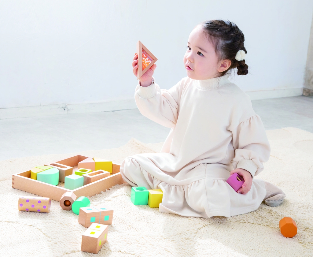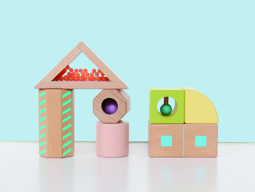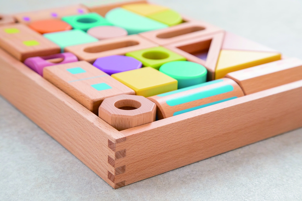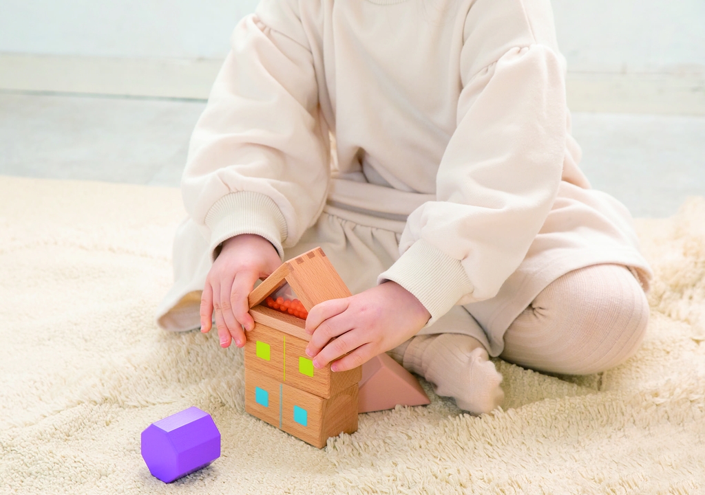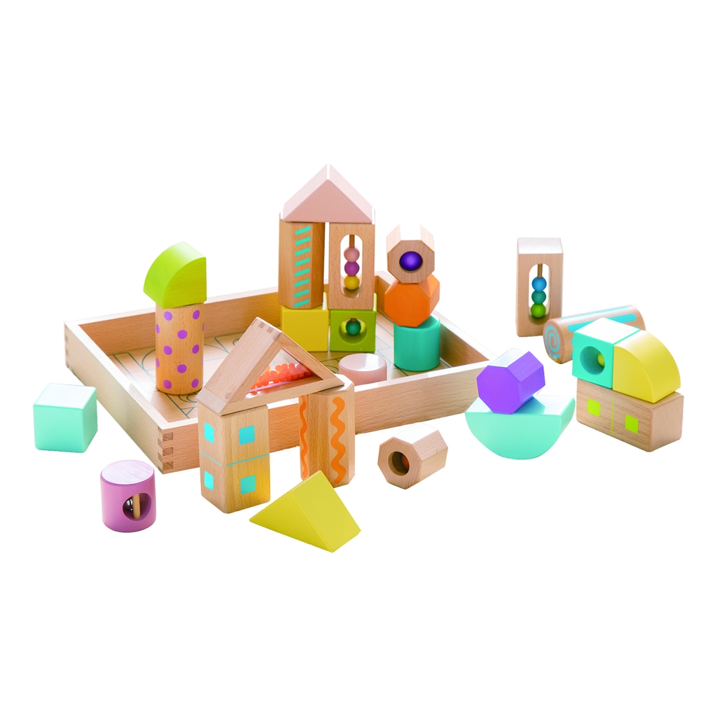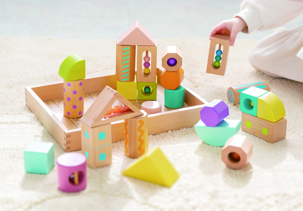 - Phát triển giác quan: Các khối rỗng có hạt/bi bên trong (sound blocks) giúp tạo ra âm thanh nhẹ nhàng, kích thích thính giác và khả năng nhận biết âm thanh của trẻ.