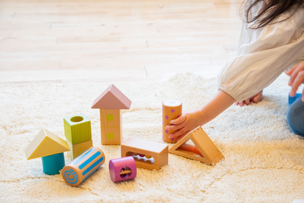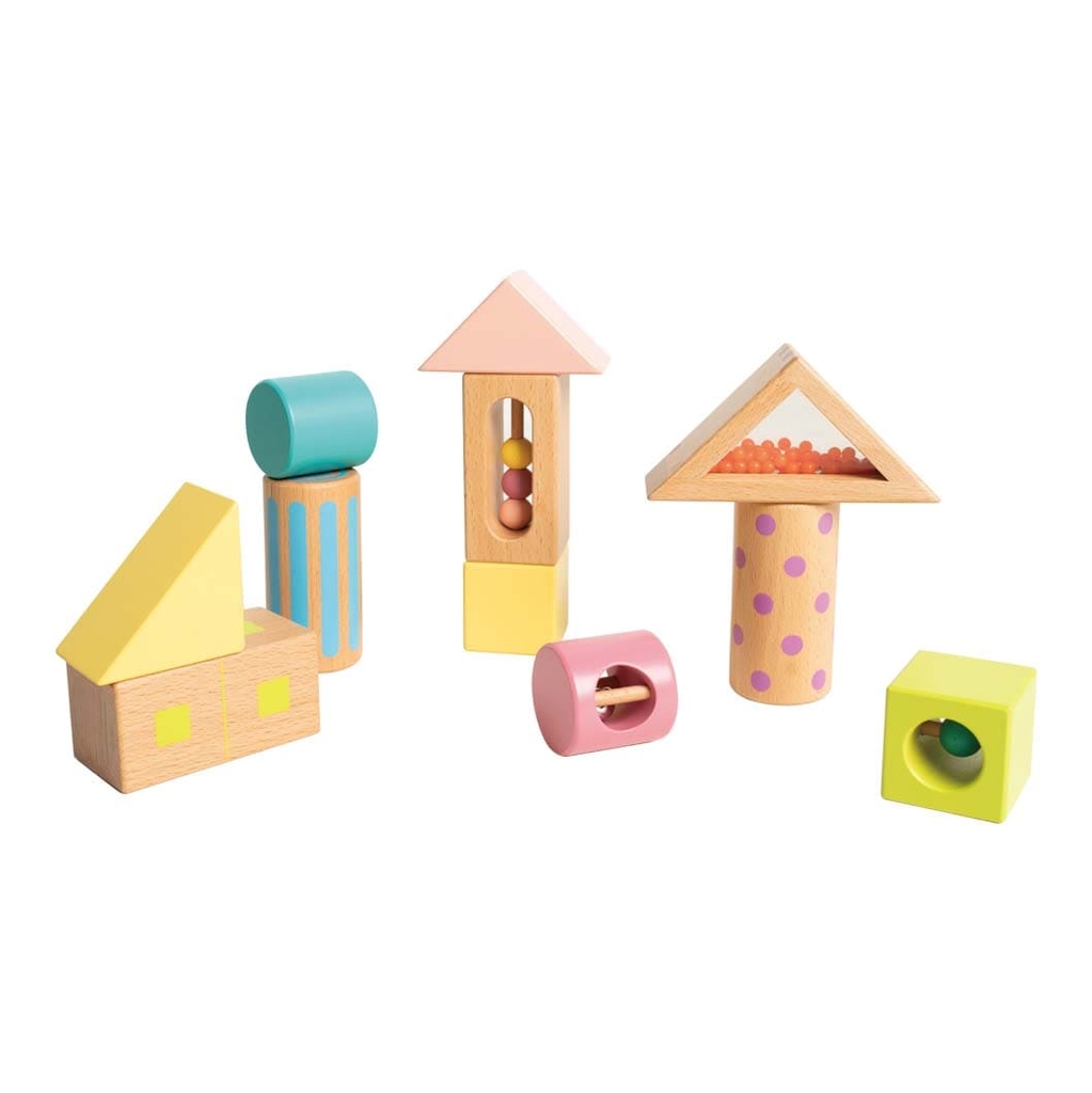 - Phát triển giác quan: Các khối rỗng có hạt/bi bên trong (sound blocks) giúp tạo ra âm thanh nhẹ nhàng, kích thích thính giác và khả năng nhận biết âm thanh của trẻ.
